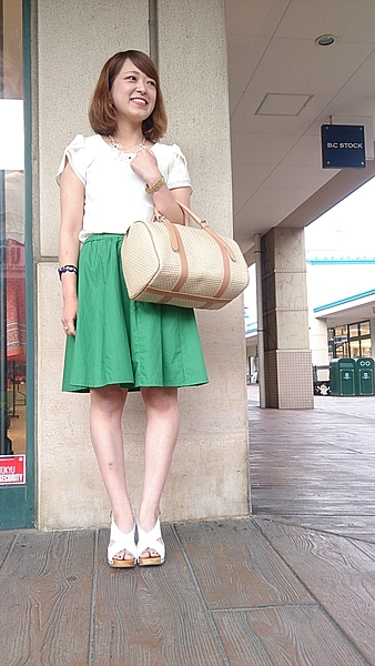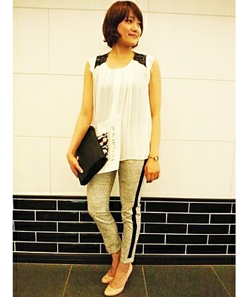 ボトムスはストライプの入った