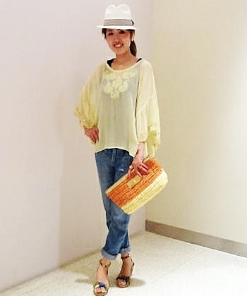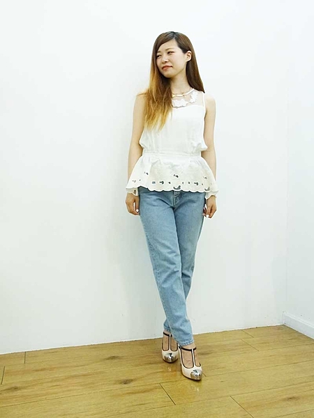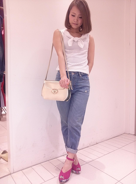 夏は思い切ってビスチェを合わせてみては??ボトムにボリュームのあるボーイフレンドデニム、トップスはぴったりとしたミニマムなシルエットにすると女っぽい着こなしに。