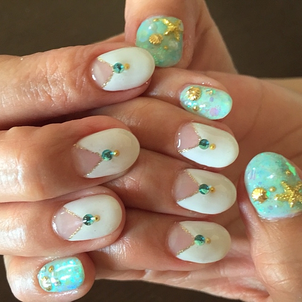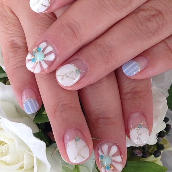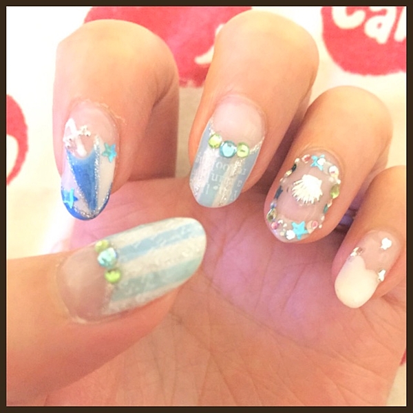 ベースをクリアネイルにする事で、よりマリン柄の爽やかな雰囲気が引き立ちます。