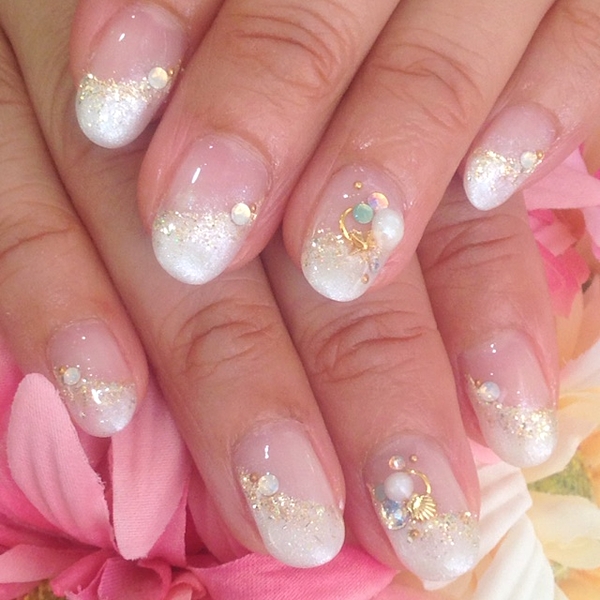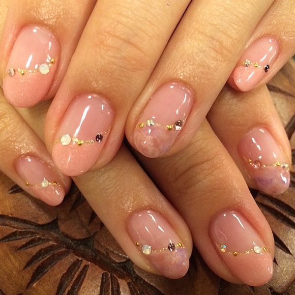 フレンチのラインを斜めに入れる事で、指を長く綺麗に見せる事が出来ます。