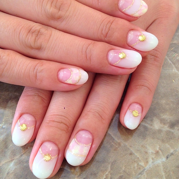 ピンクベースにシェルを散らした指が、1本ずつ入るだけでかわいさアップですね♪