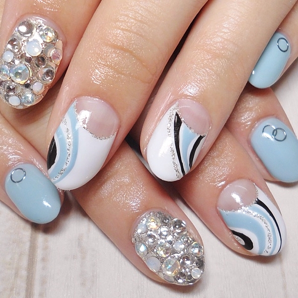 2本はフレンチラインにストーンをびっしり並べて、ゴージャスネイルの出来上がり♡
