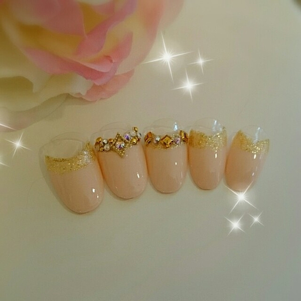 フレンチラインからラメを散らして、ストーンをのせて華やかに仕上げて♪
