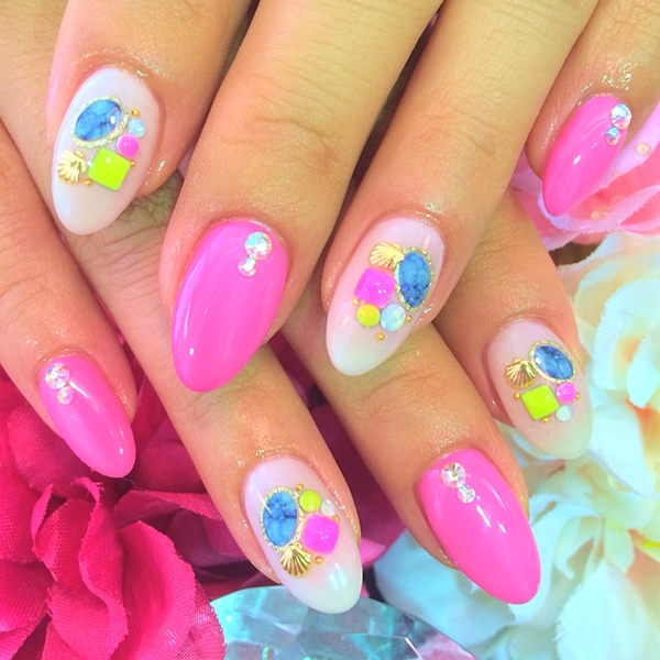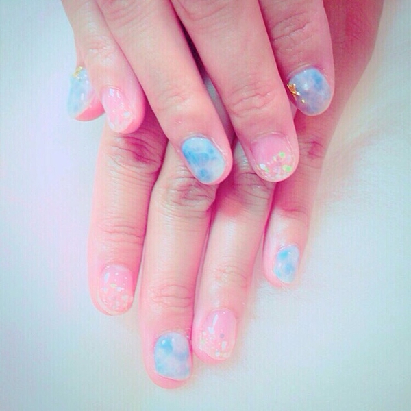 ピンクにブルーの配色がかわいいポリッシュ。夏にぴったりな鮮やかさ。