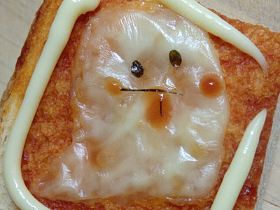 「ハロウィントースト」スライスチーズをカットして焼くだけ!簡単おばけパンの出来上がりです。,パン,チーズ,海苔,ソース,トースト,ピザ,食パン,ハロウィン,ぱん,お化け,簡単キャラ弁当