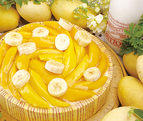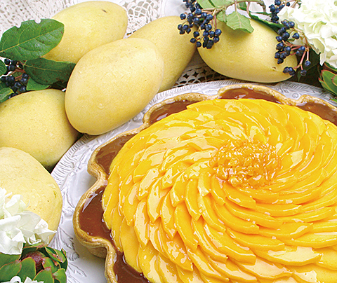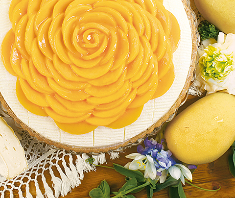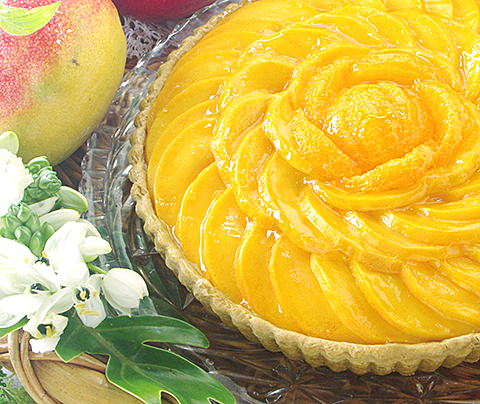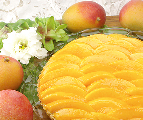 濃厚な味わいのマンゴームースとマスカルポーネのムースを重ね、タルト一面マンゴーで飾りました。舌ざわりなめらかなムースとジューシーなマンゴー、味のアクセントに選んだのは、ほろ苦いキャラメルソースです。