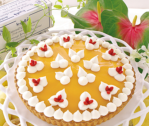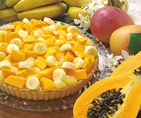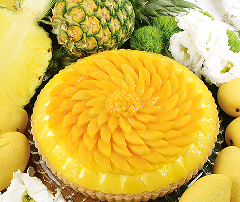 ココナッツの風味のカスタードクリームにパイナップル・パパイヤ・マンゴー・バナナなどのフルーツを飾り、南国の香りいっぱいのタルトに仕上げました。