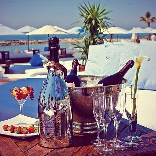 オシャレなグラスも持ち寄って2人で海のそばで乾杯