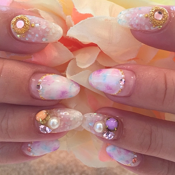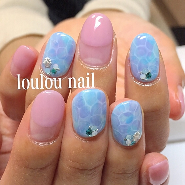 こんにちは!お客様ネイルです♡ブルー系マーブルとクリアラメベースに、シェル、パール、ストーンを置きました*\(^o^)/* http://t.co/1AKa711MrB