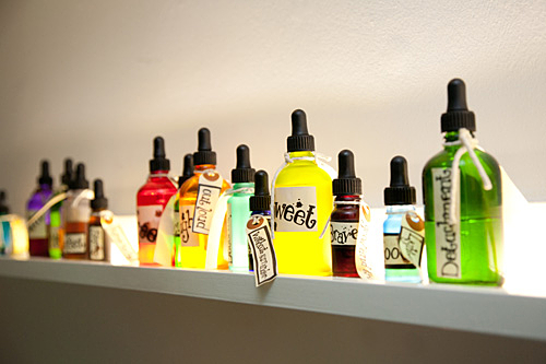 調合:店舗内にある調合室で、濃縮された香料にアルコール、水を加え最終調合。作っているところを目の前で見ることができる。