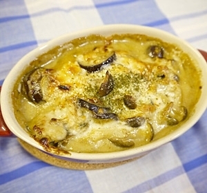 和風グラタンです。味噌と大根おろしが入っているという驚きのレシピです。具材も牡蠣としめじとナスという味噌にぴったりなんです。ご飯のおかずになるグラタンです。