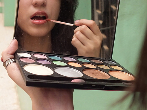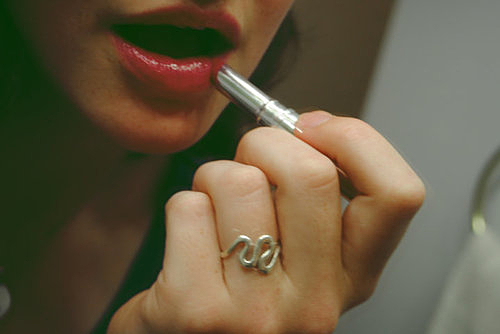 スマートに取りだし、曇りのない二面鏡でリップをお直し。