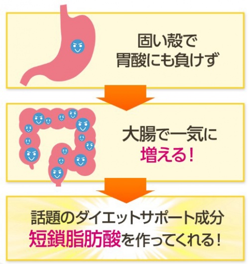 胃酸などに影響を受けずに大腸まで辿り着き、そこで爆発的に増殖してパワーを発揮します。酪酸菌によって作り出された短鎖脂肪酸は、体内に吸収され、ダイエットをグッと後押ししてくれます!