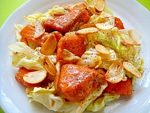 カリカリガーリック乗せ☆鮭とキャベツのオイマヨ炒め