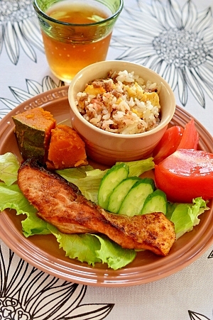サーモンのムニエルと一緒にたくさんのお野菜が摂れるのはいいですね♪