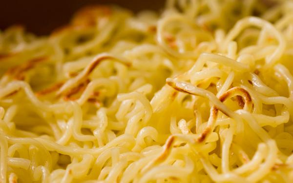 2、フライパンにサラダ油大1を強火で熱し、中華麺をほぐしながら加えて焼く。麺に薄く焼き色が付けば返して同様に焼き、いったん取り出す。