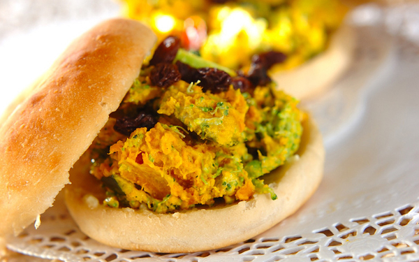 1、ベーグルの内側に<ハチミツバター>をぬり、<ブロッコリーとカボチャのサラダ>、レーズンをのせてサンドする。