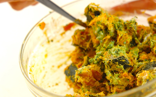 ・<ブロッコリーとカボチャのサラダ>を作る。ブロッコリーは分量外の塩を入れた熱湯で下ゆでし、粗熱が取れたら食べやすい大きさに切り、カボチャサラダとマヨネーズと和える。