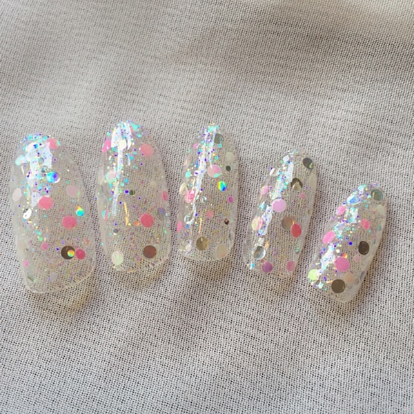 斜めフレンチは短い爪でもかわいい仕上がりになるので人気ですね! ホログラムのドットでキラキラかわいいネイル〜♡ http://t.co/i6dQpile2m