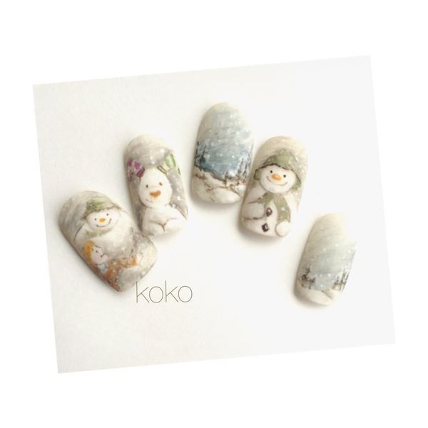 雪だるまとかわいい犬が印象的なのは「スノーマンとスノードッグ」のネイルです。全体的に白を貴重としているところで、まるで物語の世界に入った気分に!とってもかわいいです♡