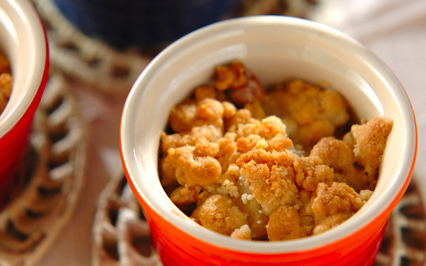 クランブルとは、タルトやケーキの上にのっている、サクサクッとしたそぼろ状のトッピングのこと。もともとは、リンゴと一緒にオーブンで焼くイギリスの伝統的なお菓子が発祥です。