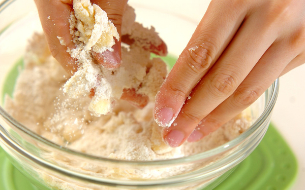 バターは柔らかいとポロポロにならないので、使う直前まで冷蔵庫で冷やしておきます。こねるのではなく、指先でこすりあわせるようにするのがポイント!