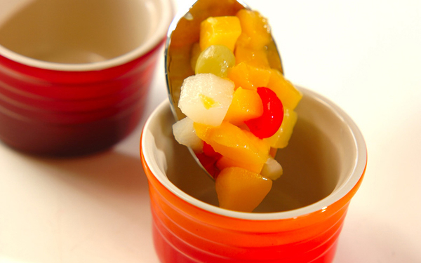 2、ミックスフルーツは、汁気をきってキルシュをからめる。耐熱ココットに入れ、クルミを手で割ってのせる。
