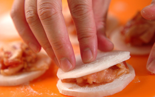 2、大根の両面に片栗粉を振るい、豚肉をはさんで軽く押さえる。