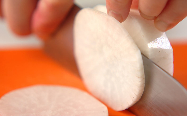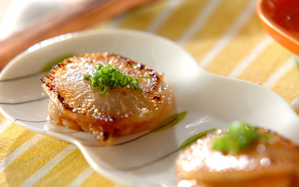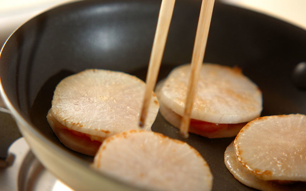秋になり甘みが増した大根で、焼肉味の豚肉をハンバーガーのようにサンド。見た目が楽しいだけでなく、こってり味のお肉とさっぱりとした大根の組み合わせは、大人もクセになる美味しさ。