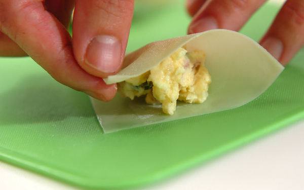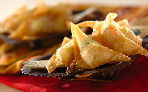 2、シューマイの皮で(1)を三角形に包み、水で留める。170℃に予熱した揚げ油でキツネ色に揚げ、マスタードと一緒に器に盛る。