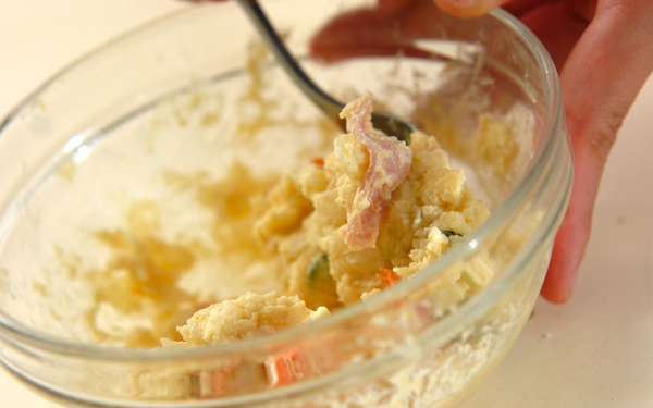 1、ポテトサラダにカレー粉を加え、混ぜ合わせる。