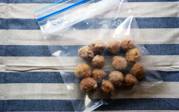 夕食のハンバーグを作ったついでに、同量のタネでミートボールを常備菜として作っておき、月曜、火曜はその半量ずつ使って和風、中華風に味付け。1度に作ったものを3日活用できます。