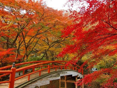 鮮やかな色に染まった葉は、真っ赤な橋が