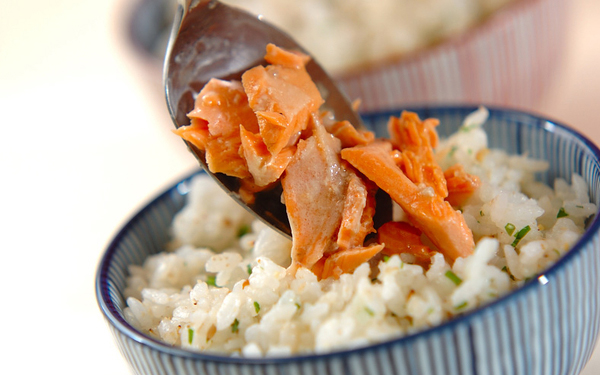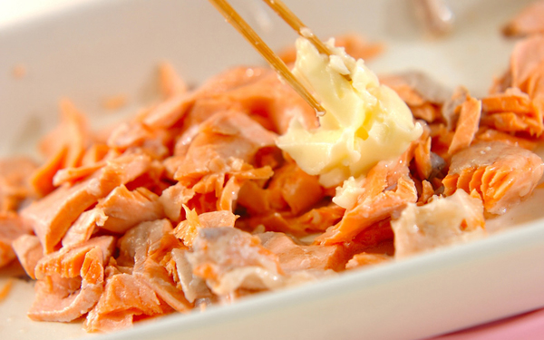 1、生鮭は耐熱容器に入れ、塩を振って酒をからめ、ラップをして電子レンジで1分30秒~2分加熱する。粗熱が取れたら蒸し汁を捨て、骨と皮を取り除いてほぐし、バターを余熱で溶かしながらからめ、さらに薄口しょうゆを合わせる。