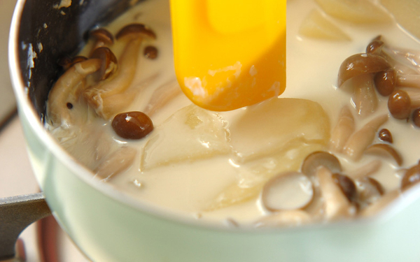 2、鍋に<クリーム>の材料、ジャガイモとシメジを入れて火にかけ、煮たったら鍋に蓋をして弱火で煮る。ジャガイモに火が通ったら蓋を外し、ゴムヘラで粗く崩しながら煮てトロミをつける。