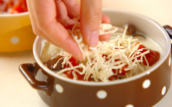 3、耐熱容器にバターをぬり、(2)、ミートソース、ピザ用チーズを順にのせてオーブントースターで焼く。ピザ用チーズがキツネ色になったら取り出し、ドライパセリを振る。