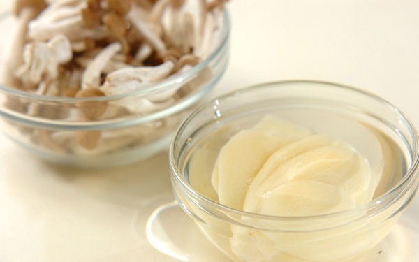 1、ジャガイモは皮をむき、厚さ1cmに切って水に放ち、白濁したらザルに上げる。シメジは石づきを切り落とし、ほぐす。
