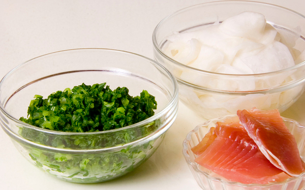 1、カブは葉を切り落とす。葉は塩を入れた熱湯でゆでて水に取り、粗熱が取れれば水気を絞ってみじん切りにする。カブはスライスして塩を振り、水が出てくればサッと水洗いして水気をしぼる。生ハムは食べやすい大きさに切る。