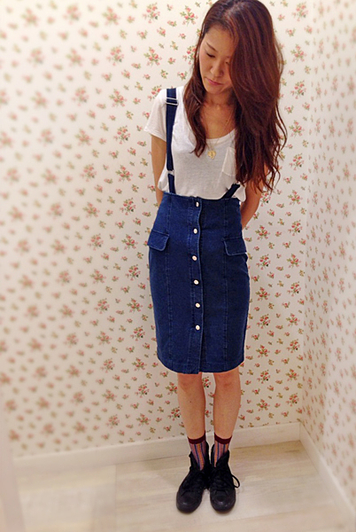シンプルなTシャツでも、サスペンダー付きのスカート履くだけでオシャレに見えちゃいます♡