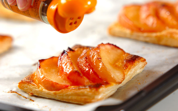 3、200℃に予熱しておいたオーブンで15分、パイがサクッと焼けるまで焼く。お好みでシナモンパウダーを振り、器に盛る。