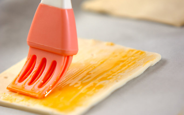 1、天板にオーブンシートを敷いてパイシートを並べ、卵黄を水少々でのばしたものを全体にぬる。
