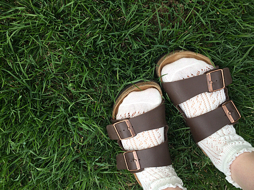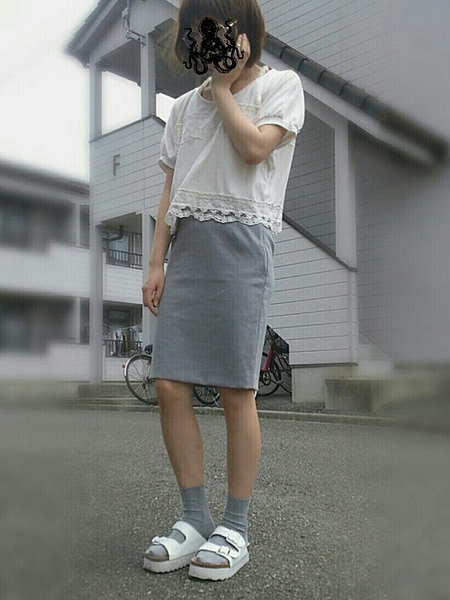 タイトスカートにコンフォートサンダルを合わせる時は靴下を履くのがお約束みたい。