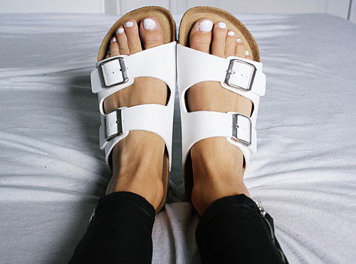 シンプルなモノトーンコーデにコンフォートサンダルでラフに。