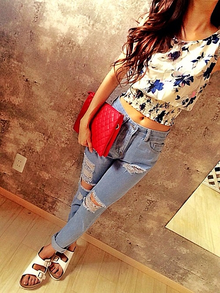 花柄トップスにブルーのボーイズデニムが爽やかで夏らしい。