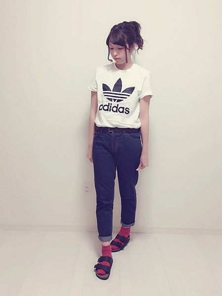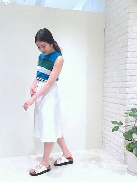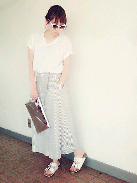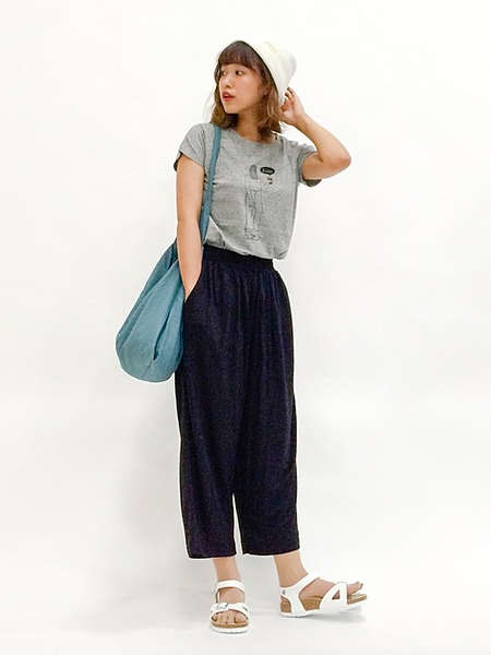 ガウチョ×Tシャツにコンフォートサンダルの合わせが多発していました♡