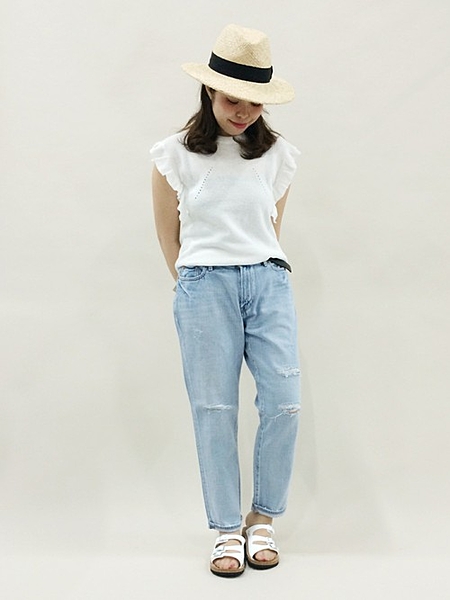 メンズっぽい印象になりがちなボーイズデニムも肩フリルのトップスと合わせれば女の子らしくて◎