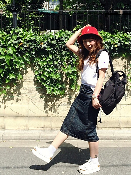 デニムのタイトスカートもミディアム丈で今年っぽさがあっていい。
