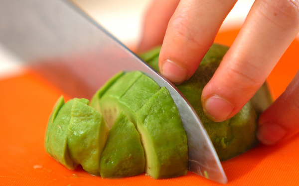 2、アボカドは皮と種を取り除き、食べやすい大きさに切る。