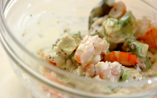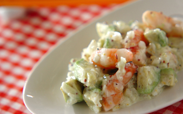 女性にも子どもにも人気のエビとアボカドを、ヨーグルトとマヨネーズでさっぱりと和えたヘルシーサラダ。