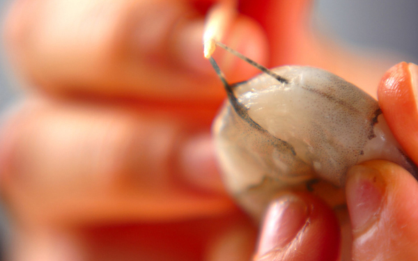 1、エビは殻と背ワタを取り、塩水で洗って分量外の酒の入った熱湯でゆでる。ザルに上げて水気をきり、食べやすい大きさに切る。